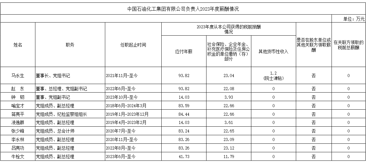 당 중앙위원회와 국무원이 국유기업 사장 연봉제도 개혁을 심화하기 위한 관련 요구와 국무원 국유자산감독관리위원회 관련 규정에 따라 2023년 중국석유화공회사 사장 연봉 상황을 다음과 같이 공개합니다