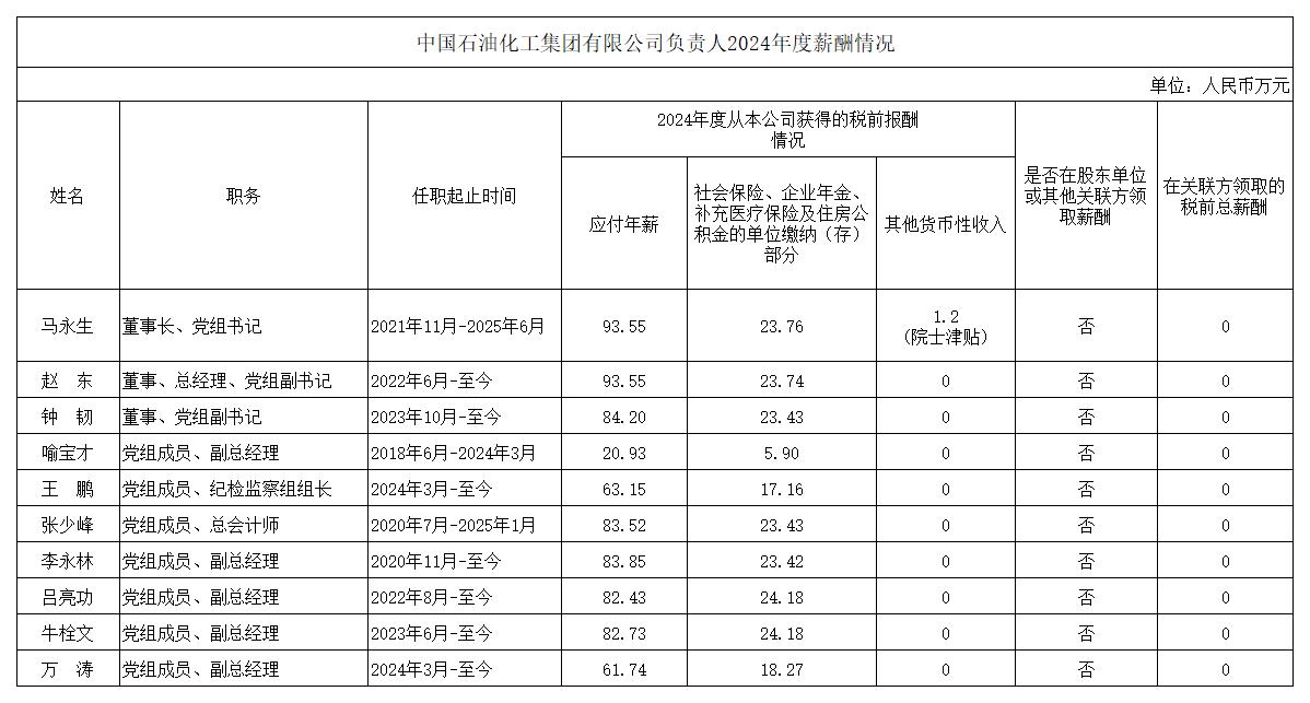 당 중앙위원회와 국무원이 국유기업 사장 급여체계 개혁을 심화하기 위한 관련 요구와 국무원 국유자산감독관리위원회 관련 규정에 따라 2024년 중국석유화공회사 사장 연봉 상황을 다음과 같이 공개합니다