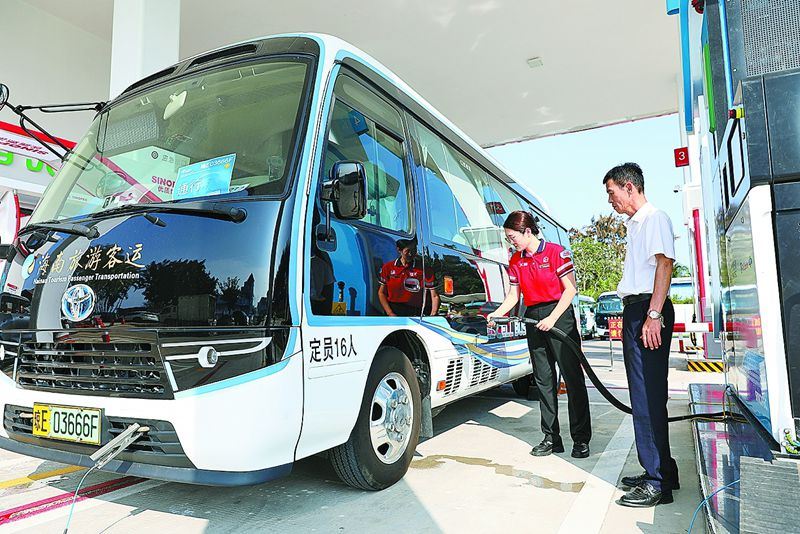 사진은 3월 22일 하이난 석유 Qionghai Yinfeng 충전소에서 수소 연료를 충전하는 아시아 보아오 포럼을 제공하는 셔틀 버스를 보여줍니다 사진: Chen Yuanping