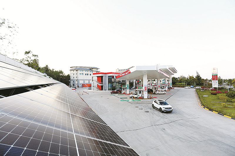 사진은 하이커우 용완로 주유소의 태양광 발전 프로젝트를 보여줍니다 이 프로젝트는 현재 하이난석유의 최대 규모 태양광 발전 프로젝트로 올해 초 발전용 그리드에 연결됐다 사진: Chen Yuanping, 글: Zhang Huihui