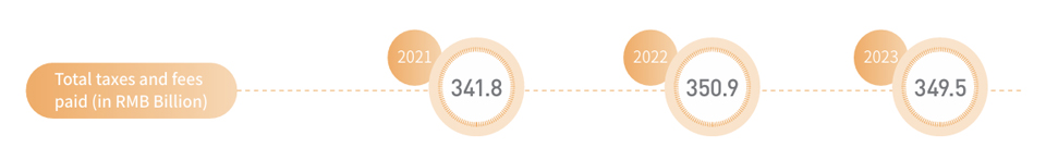 세금은 경제 발전을 지원하고, 사람들의 복지를 개선하며, 사회 안정을 유지하는 데 중요한 역할을 합니다 Sinopec은 모든 관련 조세 정책 및 규정을 엄격히 준수하여 조세 관행의 규정 준수와 무결성을 보장합니다 2023년에 회사는 세금 및 수수료로 3,495억 위안을 기부하여 국방, 과학, 교육, 문화, 의료 등 분야의 공공 서비스 발전에 기여하고 국가 경제 발전과 사회 안정을 촉진하며 공동 번영 달성이라는 더 넓은 목표를 달성했습니다